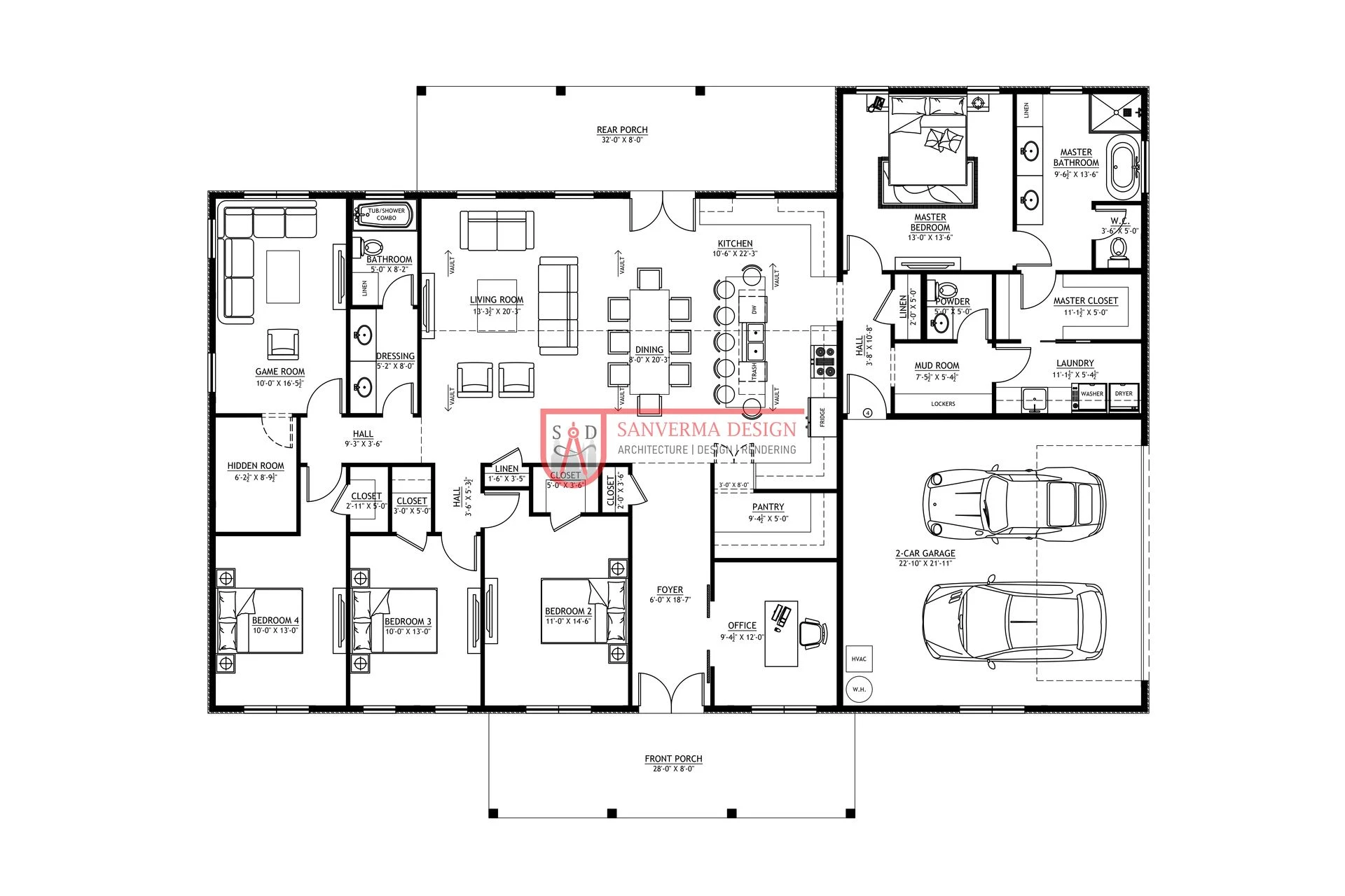 Unique features within this plan include an office, game room, and a hidden room. The office is an ideal nook for remote workers or students, providing a quiet zone for concentration and productivity. The game room is perfect for leisure, while the hidden room adds an intriguing element to the home, serving as a secure storage area or a cozy private retreat.